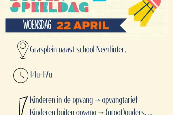 De buitenspeeldag gaat door bij de speeltuin Grote Steenweg Neerlinter (rechts langs de bib en school de Regenboog). Deze start vanaf 14u met tal van gratis activiteiten en een knabbeltje voor elk kind.